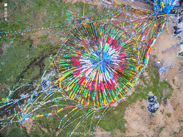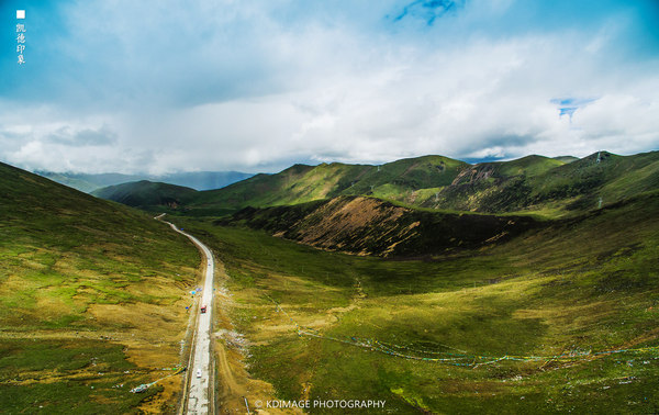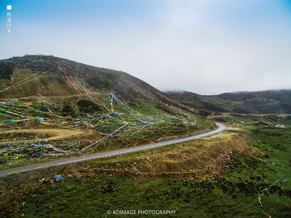 经幡飘扬在这个 五千多米的山口,周围是连绵的山脉还有雪山。垭口的风很大,气温低了很多,在这里连走路都会气喘吁吁。我们在这个海拔放飞无人机,第一次挑战这么高的海拔,还是有点胆战心惊的,幸好还是安全返航。广阔的绿色草甸和延绵的318国道看着让人心情舒畅。