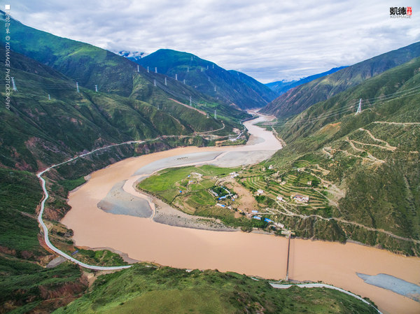 只要过桥,就进出一次西藏了。两岸有许多的大拐弯。我们在江边起飞。拍摄这里的梯田,在如此艰险的地段都能够生活下来,需要多少的努力和汗水。