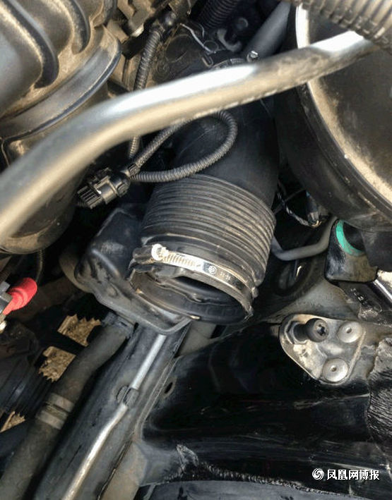 接下来就是要准备拆下空气滤芯了,第一次拆的童鞋要注意了,图中标出来的就是连接空气滤芯的接口,不要像我这样拽了半天也没拔出来,原来这上面有个小机关,有个凸起的小开关左手往下按的同时右手往后面拉,它就出来了。(另外,告诉大家,在经过行驶后停车的拆装的童鞋要等车子发动机冷却后再动手,不让带了手套,你还是会觉得旁边的发动机很烫,会不小心被烫到。)