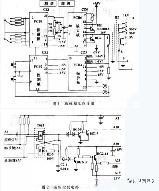 BG6—6、BG6—7、BG6—5、BG6—1、BG6—2,电位器W6—1、W6—2等元件。放大板经检修后插入机中,开启电源,慢慢调节输出至最大,用万用表交流电压档测输出变压器B2初级端电压应为16V。如电压正常则排除输出变压器的故障。继续用万用表直流电压档测量通断控制板PCB2的端子21对地电压,开关通时应为+2V,开关断时为-5V。端子18对地电压应为+0.2~0.7V(指示灯亮时)或+12V(指示灯灭)。如不正常,可判断故障源在通断控制板;如电压正常,故障可能在振荡板PCB1。测PCB1的端子21、22之间的电压应为1.6V,如无电压,推断故障原因是振荡板停振,因而不具备正常的工作条件。继续查找振荡板上的元件,检查的重点放在振荡板上的运放BG1—3,坏的可能性极大。如振荡板起振正常,接着查放大板PCB6的端子20、22之间电压应为1.6V,若远小于此参考值或没有电压,可以据此判断振荡板PCB1与放大板PCB6的连线开路或短路。查出故障点后进行线路处理或更换元器件。